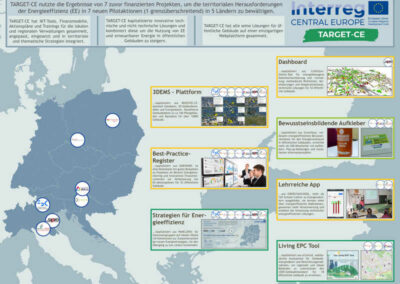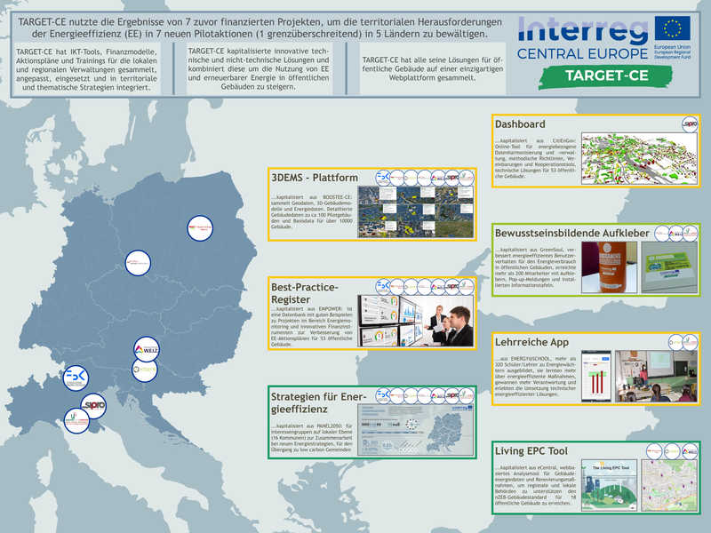 Während des gesamten Projektes wird auf technische sowie nicht technische EE- Lösungen zurückgegriffen, die aus 8 zuvor finanzierten internationalen Projekten: BOOSTEE-CE, ENERGY @ SCHOOL, FEEDSCHOOLS, eCENTRAL, CitiEnGov (Interreg-CE), EMPOWER (Interreg-EU), GreenSoul & PANEL2050 (H2020) erarbeitet wurden und jetzt im Rahmen von TARGET zusammengeführt werden.
